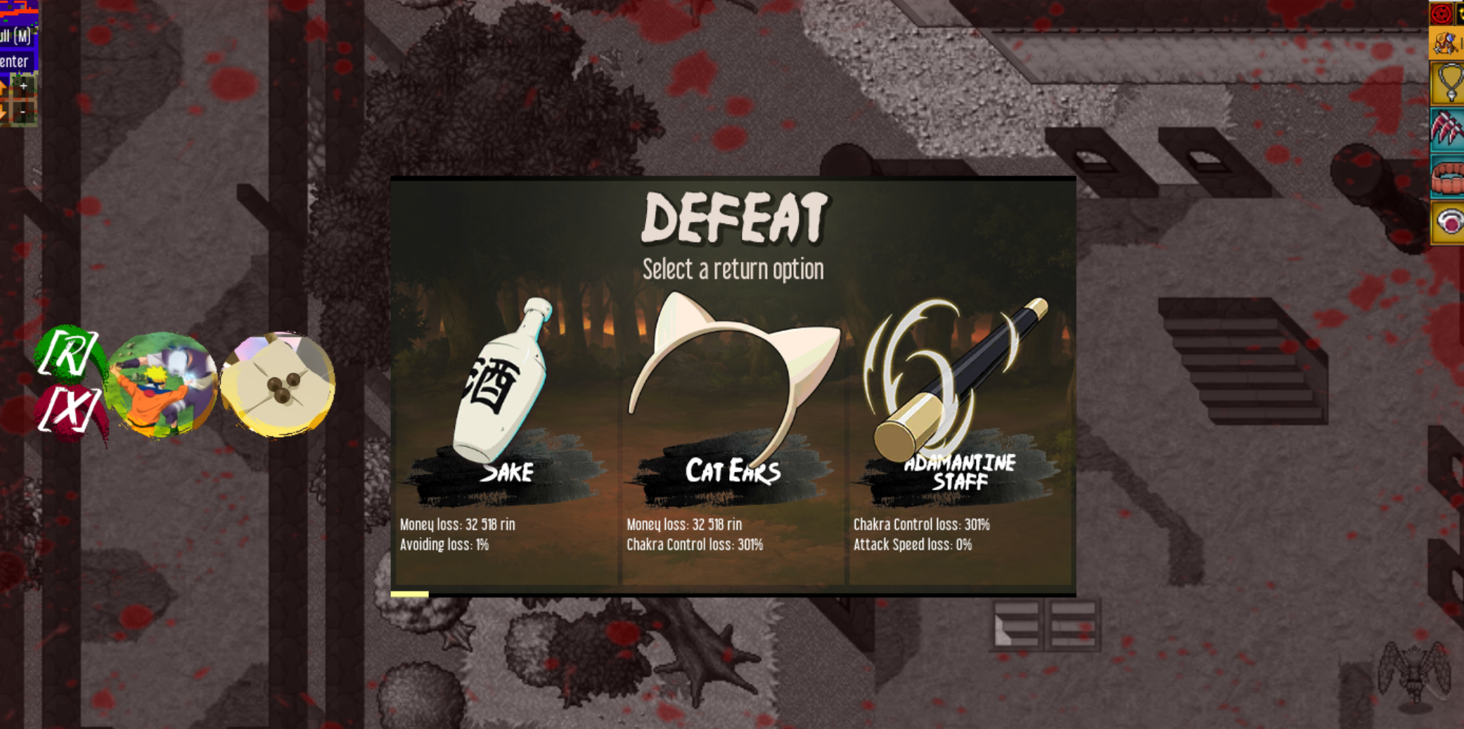 When your character is defeated and loses all Gealth Points, you usually draw three options. Each option contains a pool of losses that will apply after you choose it. The pool may include money (rin), level, and skills. Each of the options will also include the loss of a single item that will drop to your corpse.