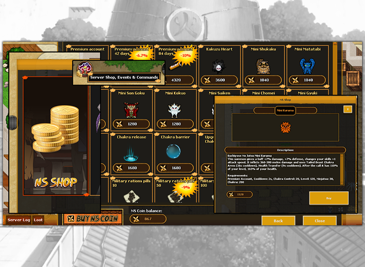 Premium is the balance of the account and the characters on the account that can be acquired by using NSC points. In the premium tab on the website you will find options for purchasing NSC and the prices of individual packages. Each character on your account can train 18 hours a day instead of 12 using the offline training system. You have access to more missions, so-called tasks, which involve defeating a certain amount of monsters. You can own a house. It's harder to tire you and you rest faster. You are able to use advanced log, which train your avoiding skill. You can enter the server without a queue and travel on a hawk. Your character loses 20% less experience, ninjutsu, skills and money upon death. You train chakra control 2 times faster and you keep your ultimate transform 33% longer. You can log in to the second character on your account at the same time. You can claim daily rewards on the last days of the week.