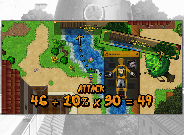 There are three types of attacking weapons. Distance weapons, blades and gloves. Weapon has two basic values, attack and block. The attack determines the damage you make. The block determines the blocking frequency of hits. You have the ability to carry two weapons at a time, that is in the left and right hands. Carrying two weapons will cause that you will inflict more damage and you will block more often, because you will receive an additional 10% of the attack and block value of a weaker weapon.