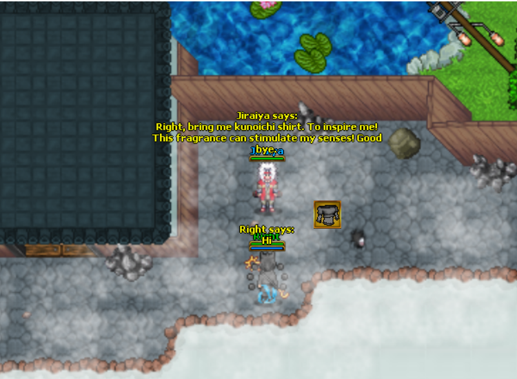 Go to Jiraya and give him kunoichi shirt to recive gift for Kakashi.