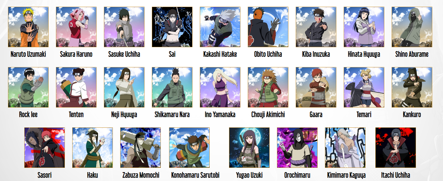 Izumo Kamizuki: Located at the main gate of Konoha. Assigns Daily Tasks for Heroes from level 200.