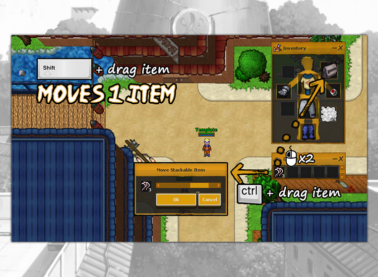 To drag a certain amount of items you need to hold ctrl. If you want to move only 1 stack of item, hold shift. If you want to put an item to your backpack much faster, you can click left mouse button two times on the item holding alt. Note that the hotkeys change as you change the control type in the game options. The methods given here are for the NS control option.